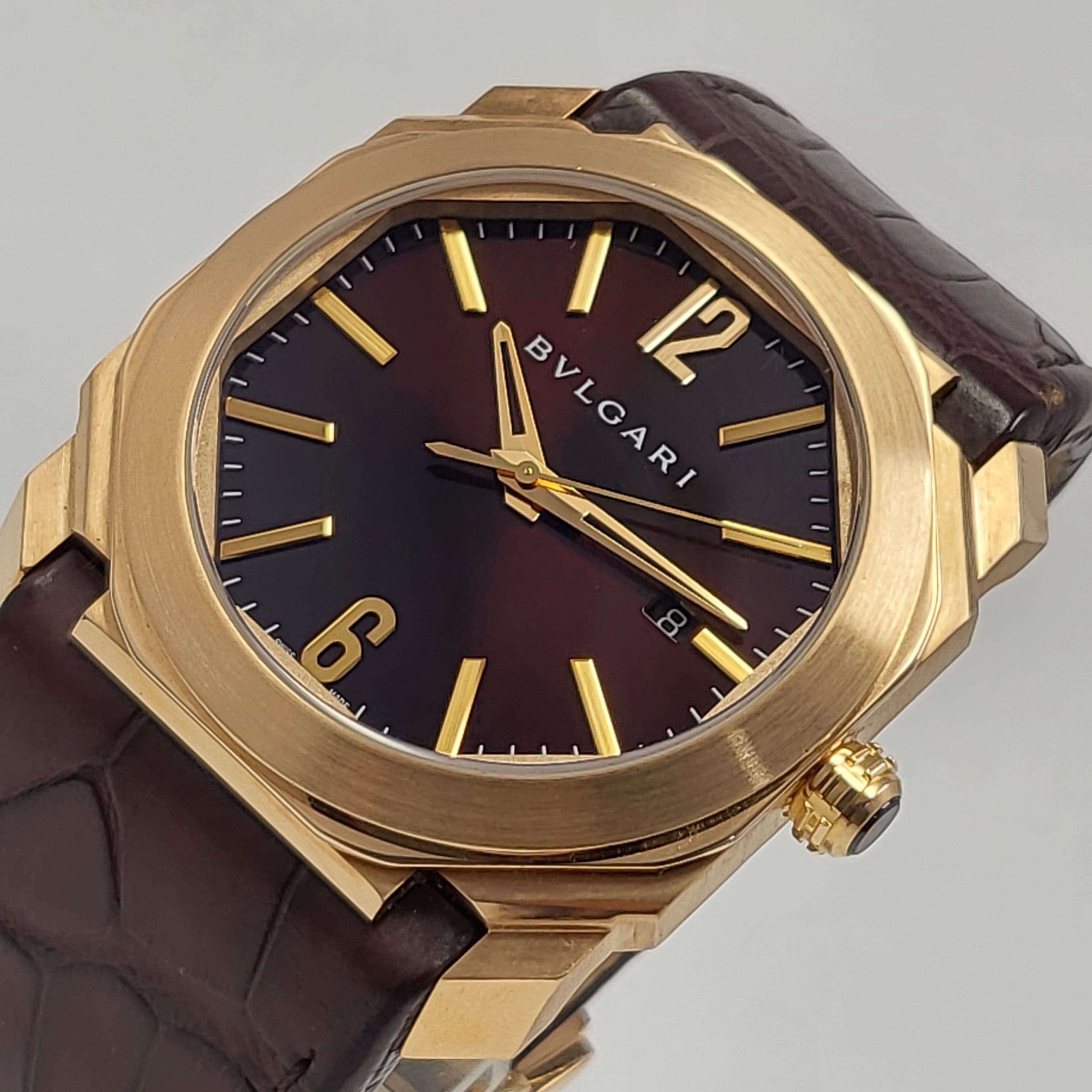 El BVLGARI Octo, Gold Rose es un reloj de lujo que destaca por su diseño icónico y sofisticado. Su caja de 41 mm en oro rosa de 18 quilates, con la inconfundible forma octogonal inspirada en la arquitectura romana, se complementa con una esfera de color marrón minimalista que aporta un aire moderno y elegante. Equipado con el movimiento automático Calibre BVL 193 de 28 joyas, garantiza precisión y fiabilidad en cada uso. La correa de piel de cocodrilo marrón con cierre plegable en oro rosa refuerza su carácter exclusivo, convirtiéndolo en la elección perfecta para el hombre que busca fusionar tradición y vanguardia en alta relojería. Descubre más sobre el BVLGARI Octo referencia BGO P 41 G Gold Rose y otros relojes de lujo en nuestra página.